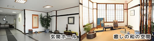 玄関ロビーには障子、畳で和の空間を設け、一般浴室は少しでも温泉気分を味わえるように筑波石を配し岩肌より湯が流れるようにしました。又、脱衣室の壁一面の白樺林のパネルや浴室の窓から眺めるやまぼうし(ミズキ科)は新緑から紅葉まで美しく入所者の方に楽しんでいただけるような環境整備に努めております。