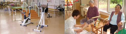 比較的症状が安定期にあり、病院での入院加療は必要ないが、看護、介護、リハビリテーションを中心にした医療ケアを必要とするお年寄りが日常生活に必要な機能を回復し、家庭生活に復帰できるためのお手伝いをする施設です。森と太陽の温和な風光の中での安らぎを感じながらリハビリを行える環境の施設です。